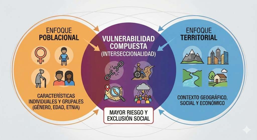 Para comprender la vulnerabilidad de manera integral, no basta con mirar al individuo; es necesario observar tanto al sujeto (Enfoque Poblacional) como al contexto en el que habita (Enfoque Territorial). Estos dos enfoques actúan como las coordenadas «X» y «Y» en un mapa de riesgos: uno define quién es la persona y el otro define dónde y cómo vive.