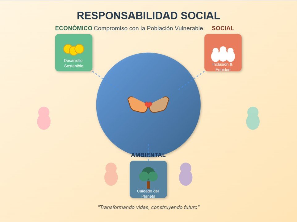 2. Dimensión Social: Compromiso activo con la equidad, la inclusión y el respeto a los derechos humanos, priorizando a poblaciones vulnerables como personas en situación de pobreza, comunidades indígenas, personas con discapacidad, migrantes, mujeres en riesgo y niños en situación de calle.